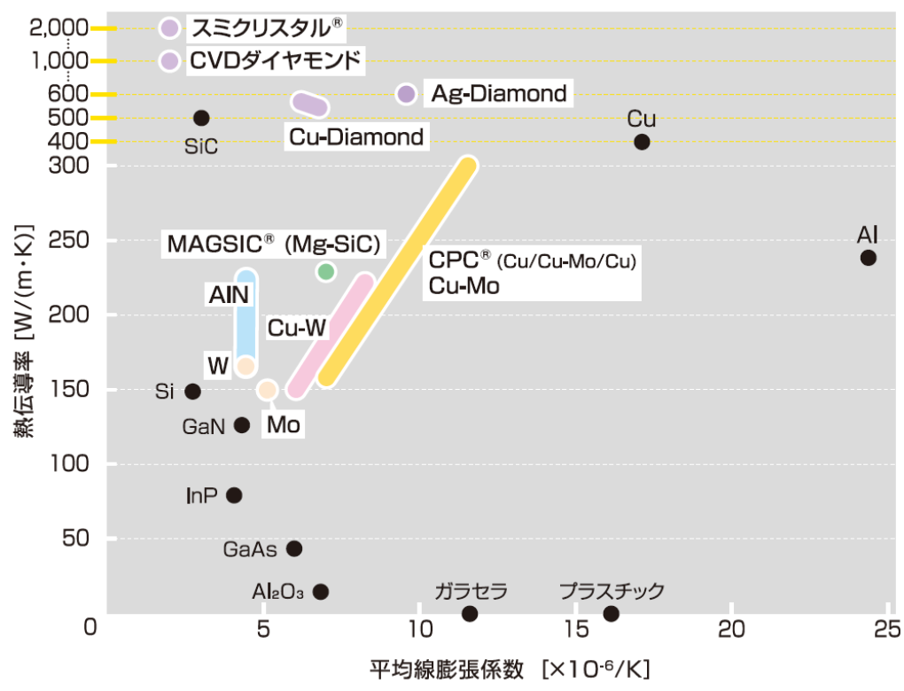 Cu-Diamond は、化合物半導体に近い熱膨張係数、かつ銅以上の熱伝導率(>500 W/m・K)を有しています。Cu-W は、銅の高熱伝導特性とタングステンの低熱膨張特性を兼ね備え、周辺材料に合わせて線膨張係数を調整可能です。